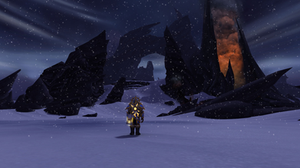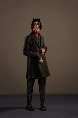 The entire set, from the garments to the backdrop, consist of muted and low value tones. The overall composition could be seen as possibly low-key, with the exceptio